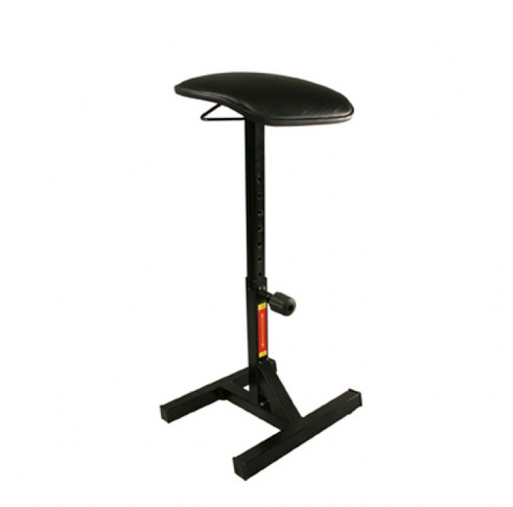 Banco semi sentado com regulagem de altura, chassi de compensado anatômico com espuma D33, revestido em vinil preto e perfil de PVC para proteção da bordas.