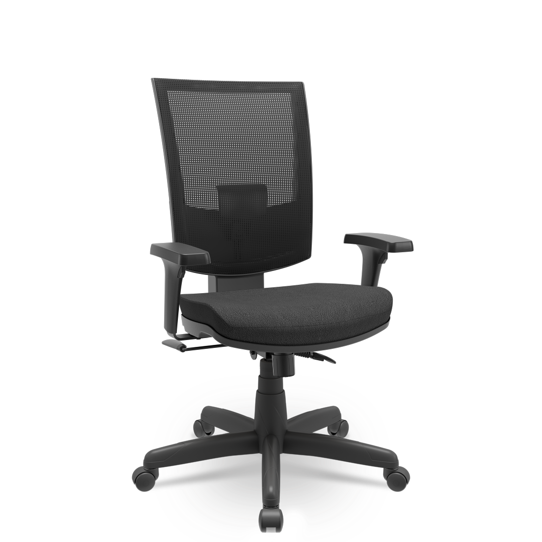 O encosto em tela mesh Back Plax oferece ventilação contínua, reduzindo o calor e a transpiração durante longas jornadas de trabalho. O apoio lombar regulável em altura proporciona suporte ergonômico personalizado para cada usuário, prevenindo dores nas costas e melhorando a postura.